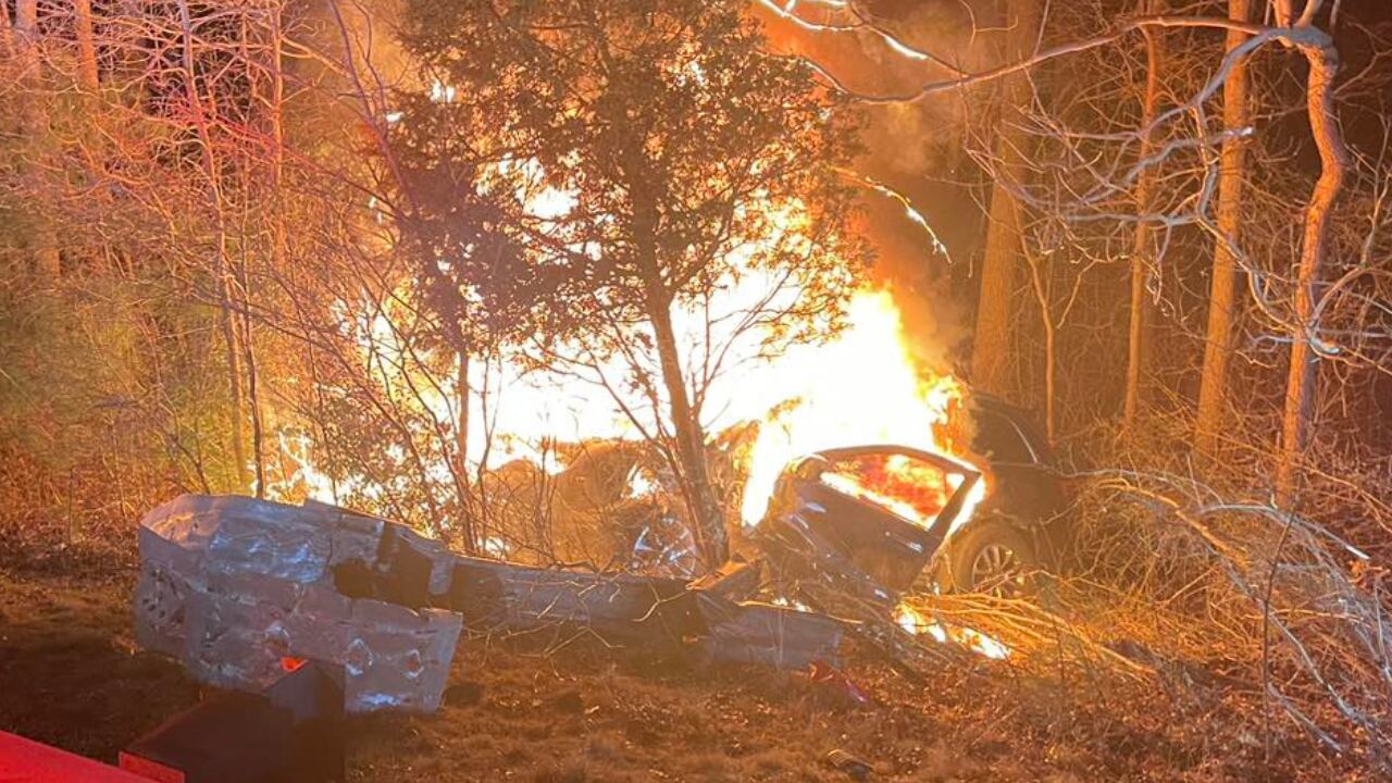 LAKEVILLE, Mass. — A car veered off of a Massachusetts highway, crashed in the woods, and burst into flames early Monday morning.