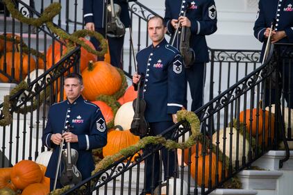 Members of a U.S. Air Force band use blacked out violas as they play for President Donald Trump and first lady Melania Trump during a Halloween trick-or-treat event at the White House, Monday, Oct. 28, 2019, in Washington. (AP Photo/Alex Brandon)