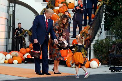 President Donald Trump and first lady Melania Trump watch a young girl as they give candy to children during a Halloween trick-or-treat event on the South Lawn of the White House, Monday, Oct. 28, 2019, in Washington. (AP Photo/Alex Brandon)