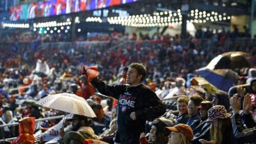 Washington fans braved rainy weather at Nationals Park to cheer the Nationals during Game 7. The game was being telecast on the monitors at the stadium.