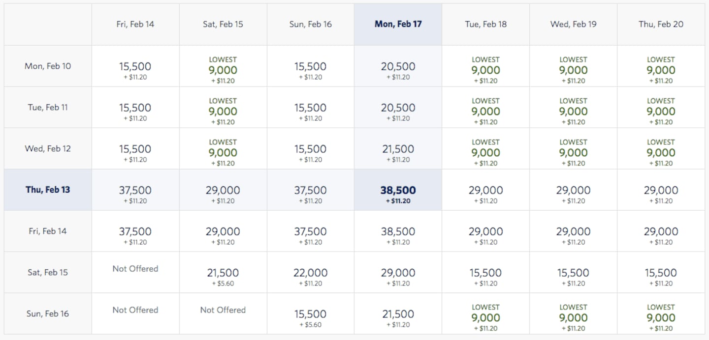 The resulting grid shows me that each ticket will cost me between 9,000 and 38,500 miles, depending on when I choose to travel. That’s quite a spread!