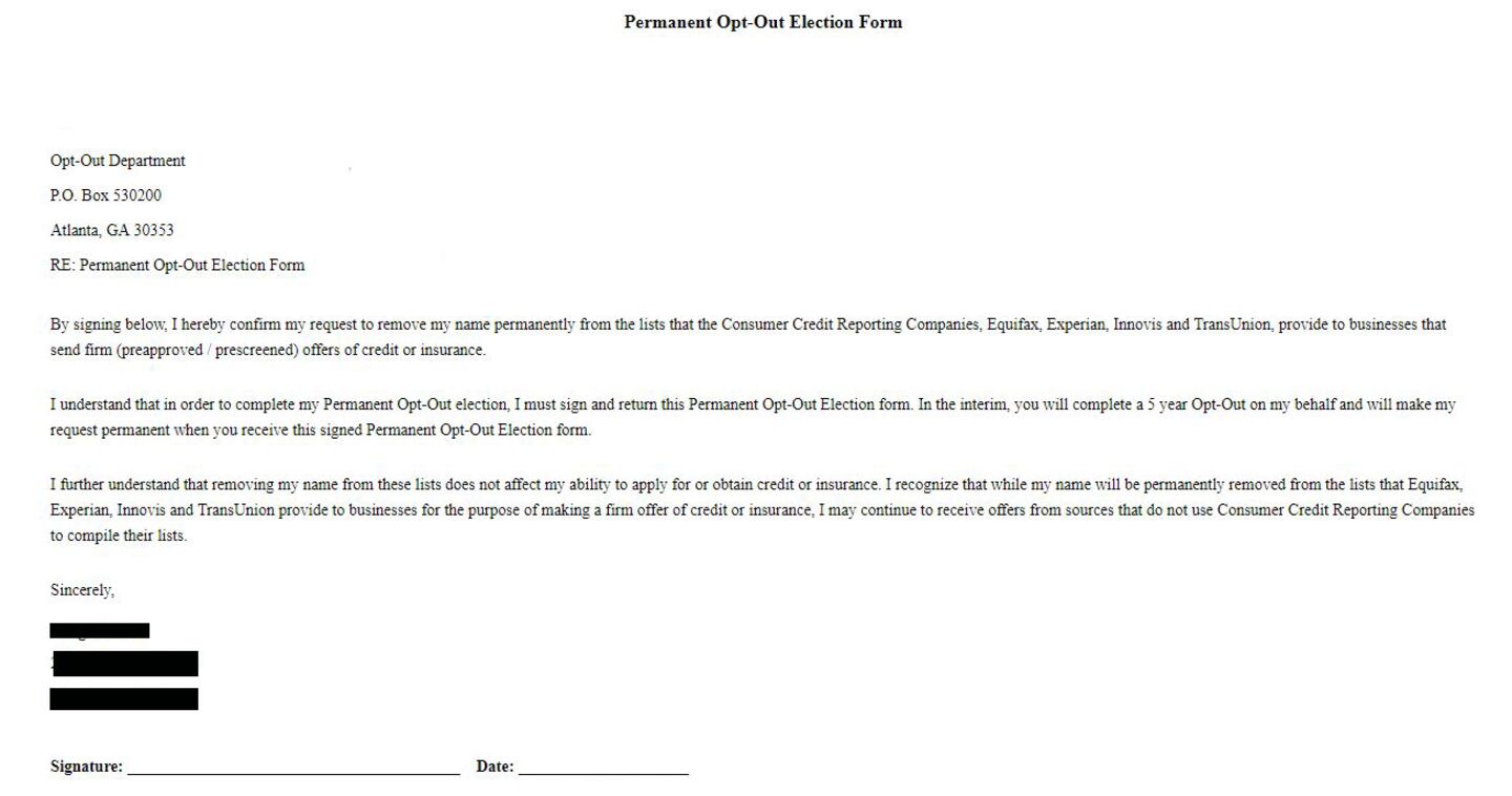 The Permanent Opt-Out Election Form is generated after you initiate the opt-out process above. On the confirmation page if you scroll to the bottom you’ll see a Permanent Opt-Out Election Form like this: