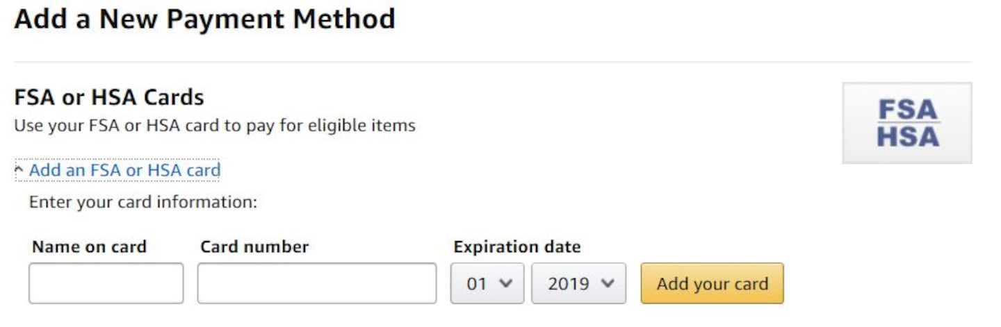 1. Add your FSA or HSA card as a payment option to your Amazon account. Click here to get started.