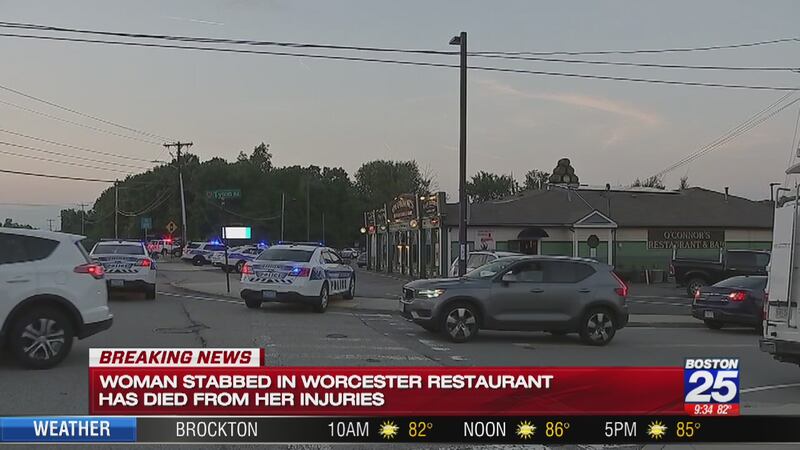 Worcester Police said the 31-year-old woman was pronounced dead at the hospital after she was stabbed inside O'Connor's Restaurant. Her name has not been released.