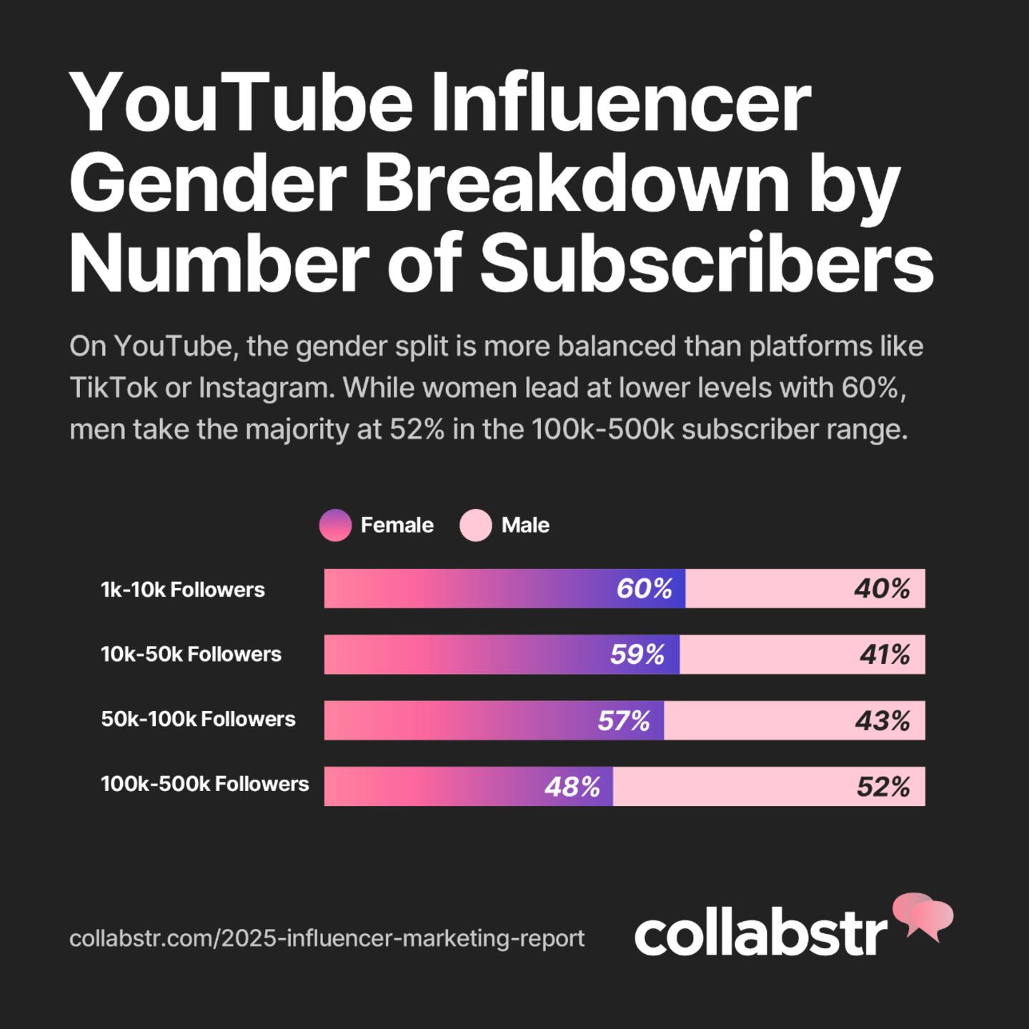 On YouTube, the gender gap is less pronounced, and the trend even reverses at higher subscriber levels. Female influencers lead with 60% in the 1K-10K tier and 59% in the 10K-50K range. However, the split becomes more balanced at 57% in the 50K-100K range, and males take the lead at 52% in the 100K-500K bracket.