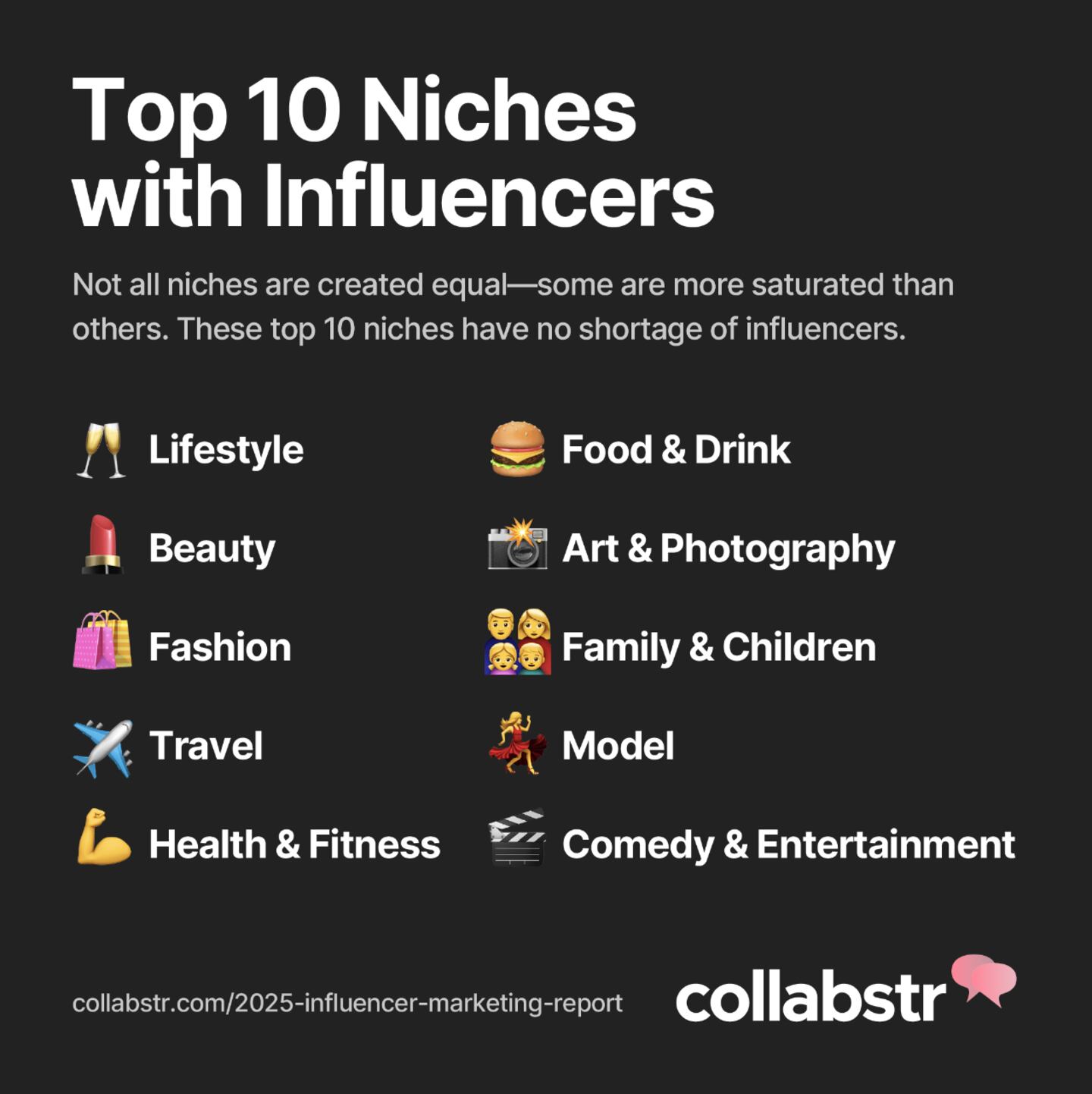 These are the niches/industries where influencers are in the highest demand, based on 1 million+ searches analyzed on Collabstr.