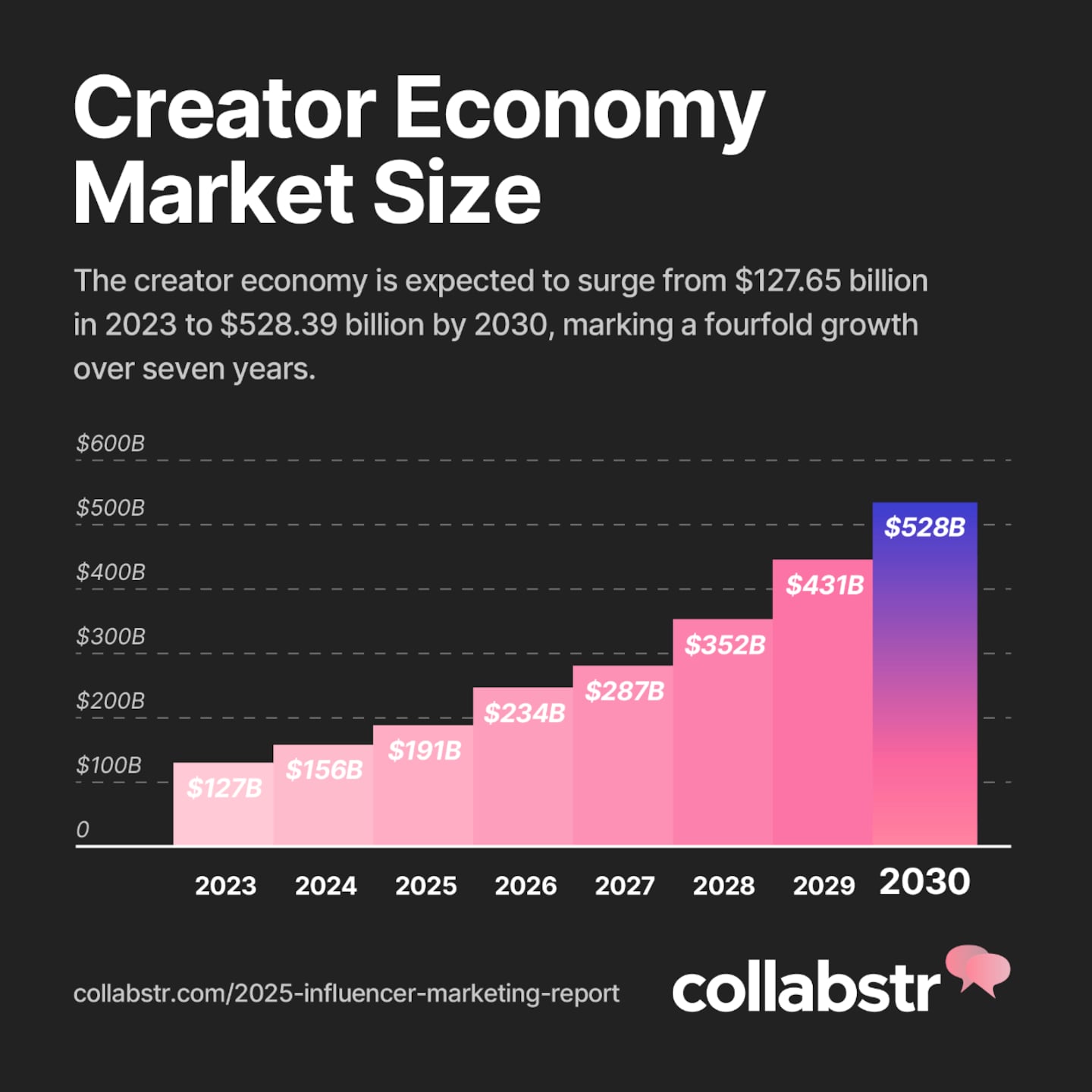 • The global creator economy is projected to grow from $191 billion in 2025 to $528.39 billion by 2030, with an impressive 22.5% CAGR.
