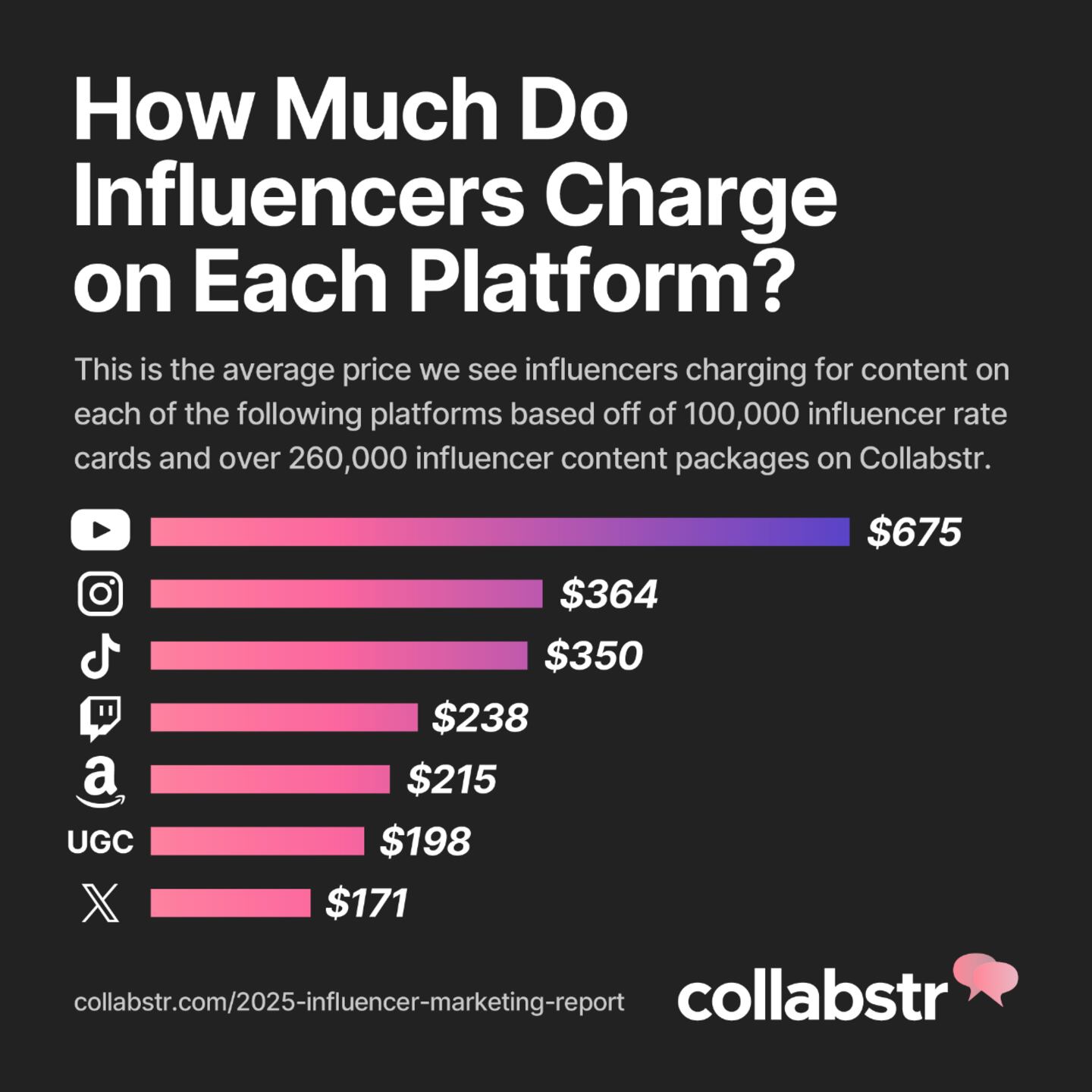 This is the average asking price for influencer content on the following platforms. This is not indicative of what brands actually pay influencers, but rather what influencers ask brands to pay them.  Last year, Collabstr only had data on Instagram, TikTok, UGC, and YouTube. This year, there are a few extra platforms.