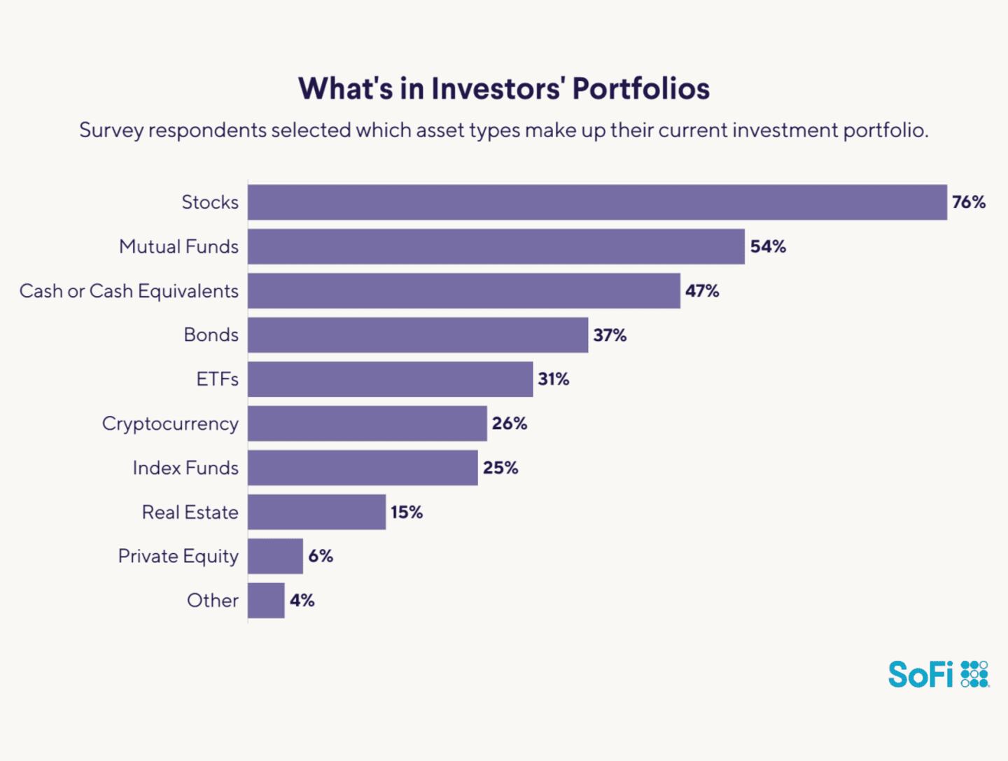 Most investors (76%) said stocks are the most common investment in their portfolios. Mutual funds, cash, and bonds were the next most popular investment types.