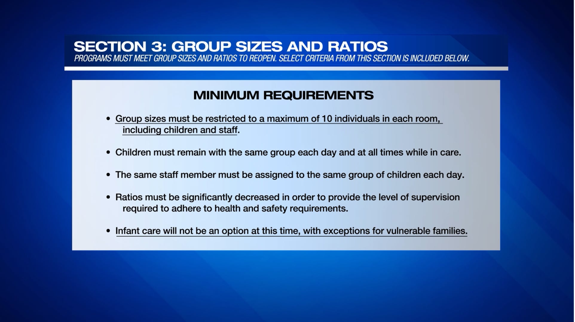 25 Investigates has learned that the Department of Early Education and Care (EEC) is weighing several options for reopening daycares during the pandemic. One plan the agency is evaluating would place minimum requirements on childcare providers. According to the document we obtained the requirements include: “Group sizes must be restricted to a maximum of 10 individuals in each room, including children and staff, Children must remain with the same group each day and at all times while in care [and] Infant care will not be an option at this time.”