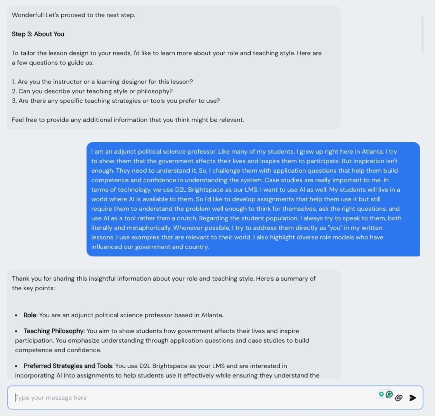 The AI starts simply, asking “Who are your students? What is your course about? What are the learning goals? What’s your teaching style?” It moves on from there: “What are the learning objectives for this lesson? How do you know when students have achieved those objectives? What are some common misconceptions they have?”