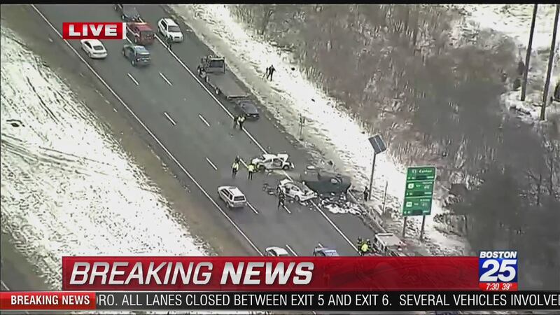 A serious crash involving at least eight cars shut down all northbound lanes on Interstate 95 in North Attleborough for hours Friday morning. All lanes were reopened to traffic around 8:30 a.m.