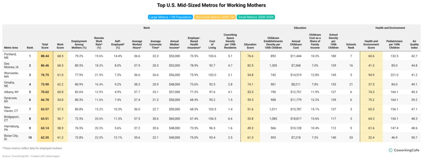 To find the best metros for working moms, CoworkingCafe analyzed data across three key categories—work, education and childcare, and health and environment. Metrics included the share of employed moms; work-from-home and self-employment rates; commute times; income; and access to employer-based healthcare. We also looked at childcare availability and affordability; school quality; cost of living; and access to pediatricians and clean air. Additionally, we split the metros into three population brackets—large, mid-sized and small.