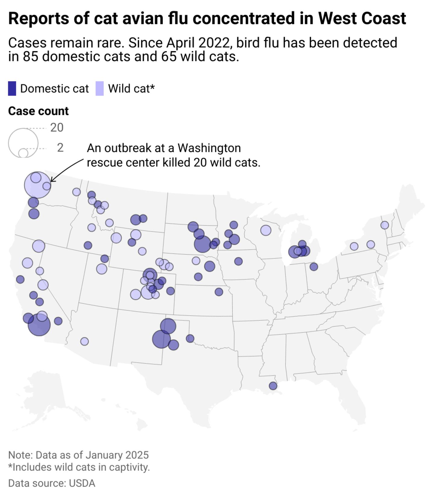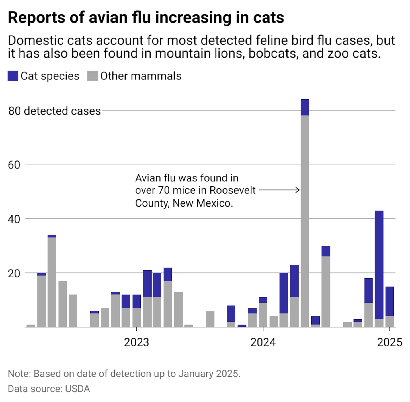 The risk of felines developing bird flu infections remains relatively low. As of Jan. 31, 2025, 150 wild and domestic cats have been detected with the disease since 2022, according to an analysis of USDA data. Among domestic cats that contracted bird flu, most were feral or dairy farm cats living in close contact with other animals.