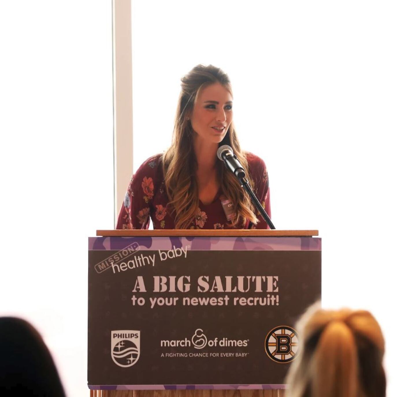 BOSTON — The Boston Bruins partnered up with the March of Dimes and Phillips to host a luncheon on Sunday afternoon to surprise more than 45 expectant military moms and dads with an educational baby shower at the UMass club.