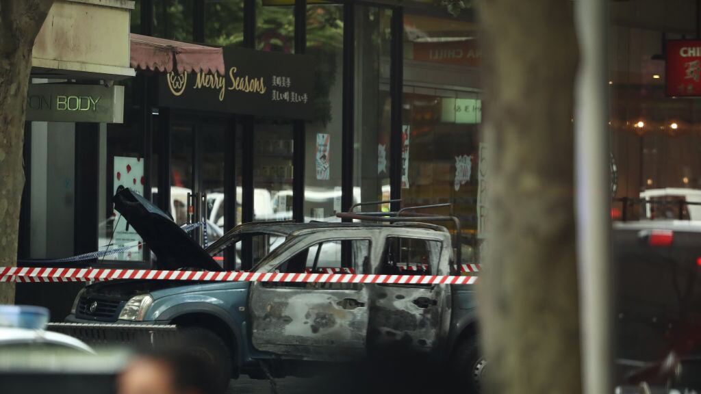 A burnt out vehicle is seen in Bourke St on November 09, 2018 in Melbourne, Australia. A man has been shot by police after setting his car on fire and stabbing several people in Bourke St mall in Melbourne's CBD this afternoon.
