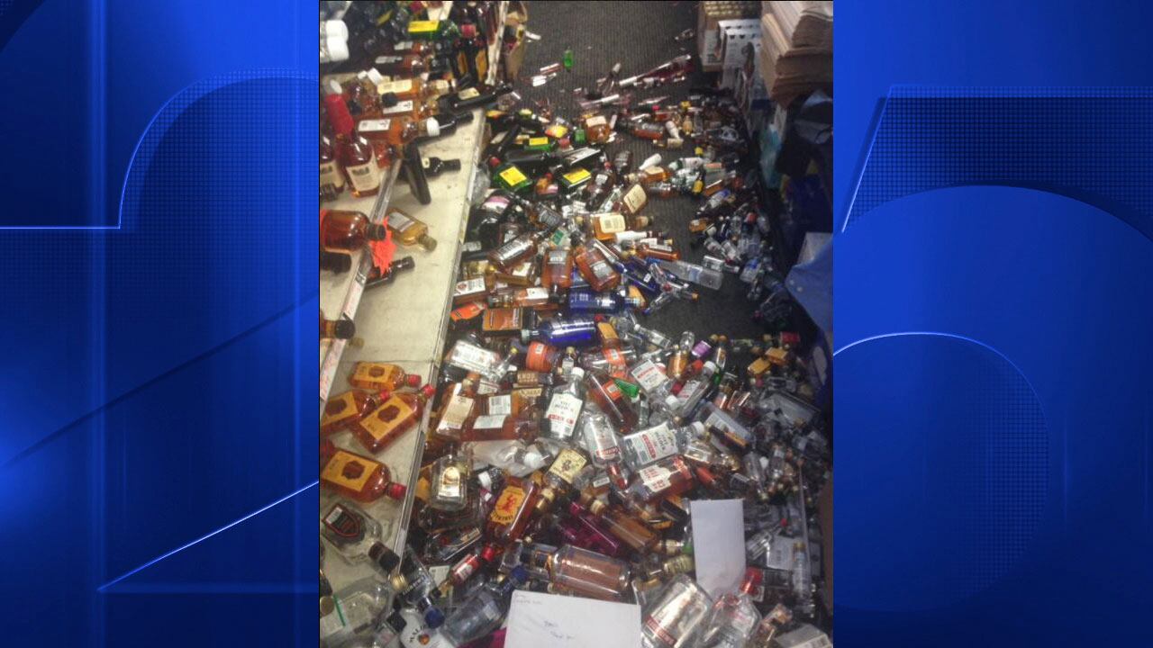 Every nip, pink and liter that was on the shelf came crashing down, sending liquor and shattered glass all over the floor.