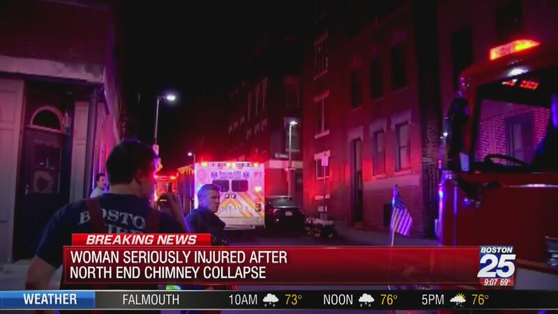 BOSTON — A 21-year-old woman lying in a hammock was seriously injured early Tuesday when a chimney collapsed and landed on top of her.