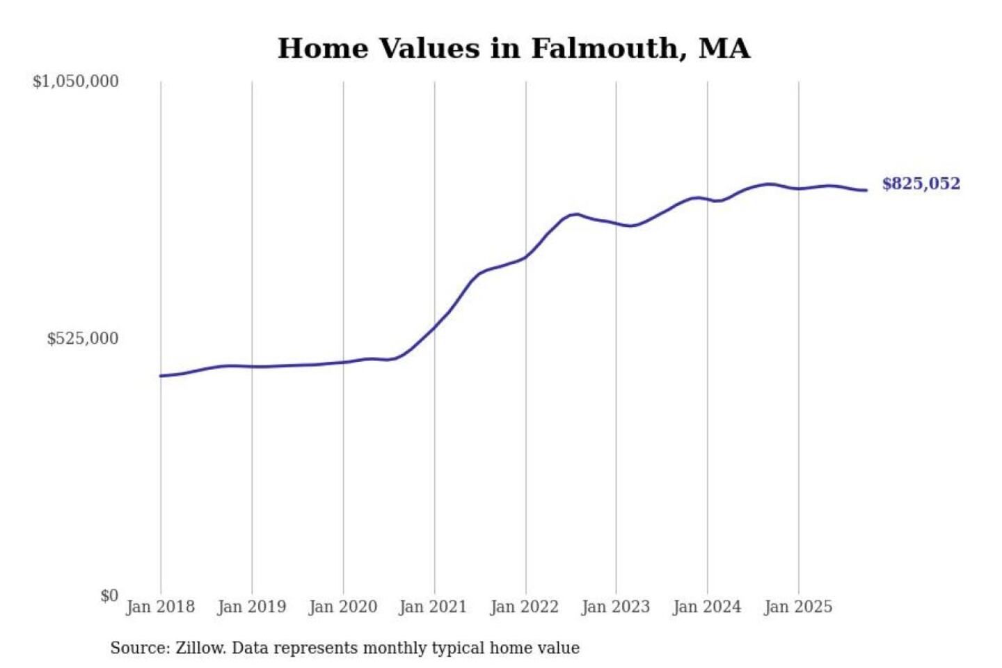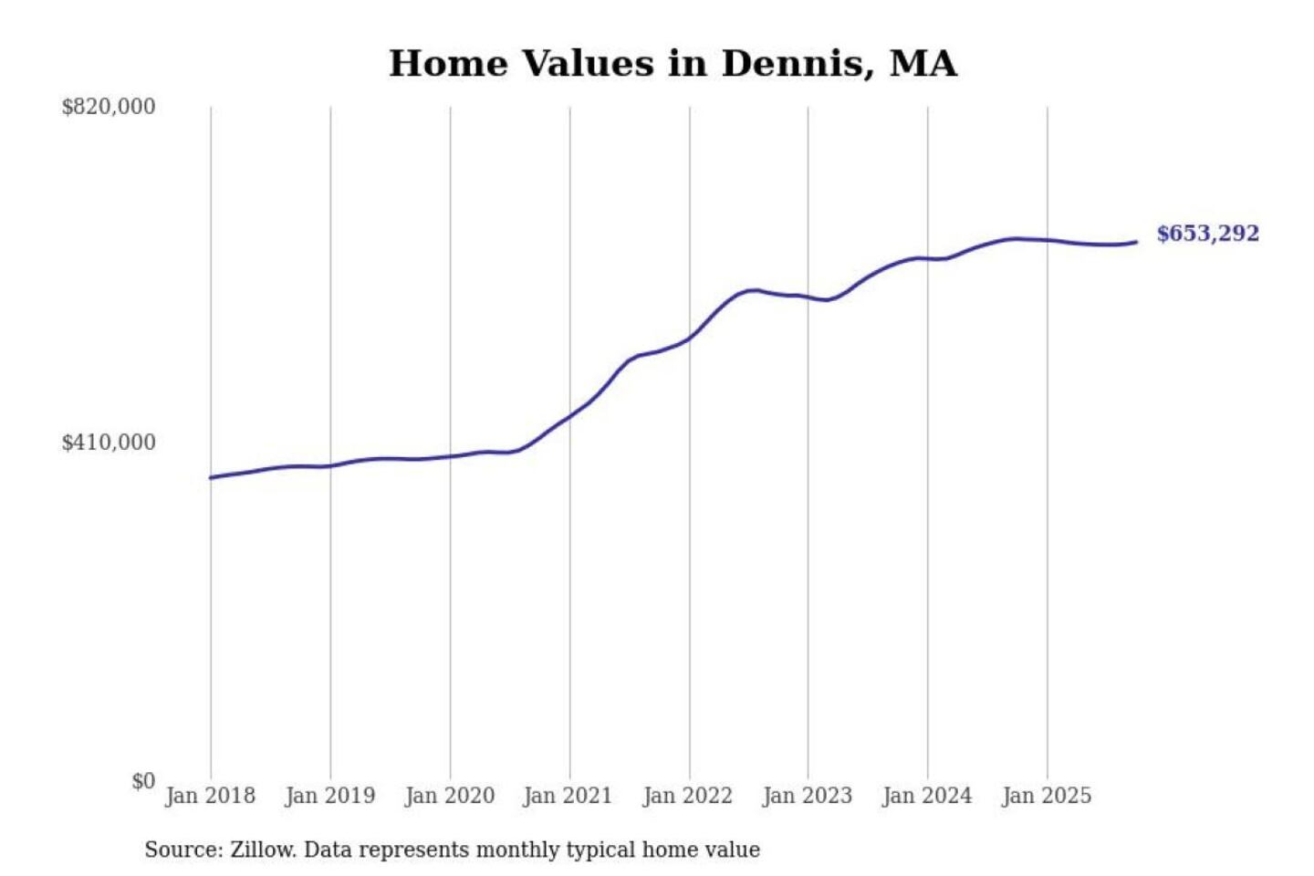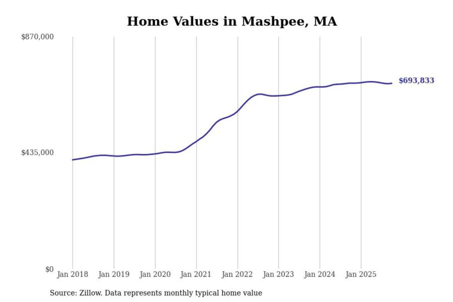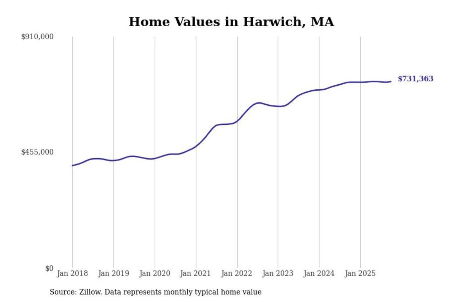 Stacker compiled a list of cities with the most expensive homes in the Barnstable Town, MA metro area using data from Zillow. Charts show the monthly typical home value since January 2018.