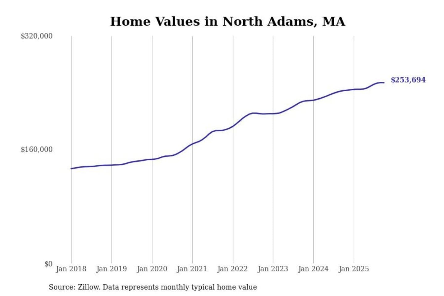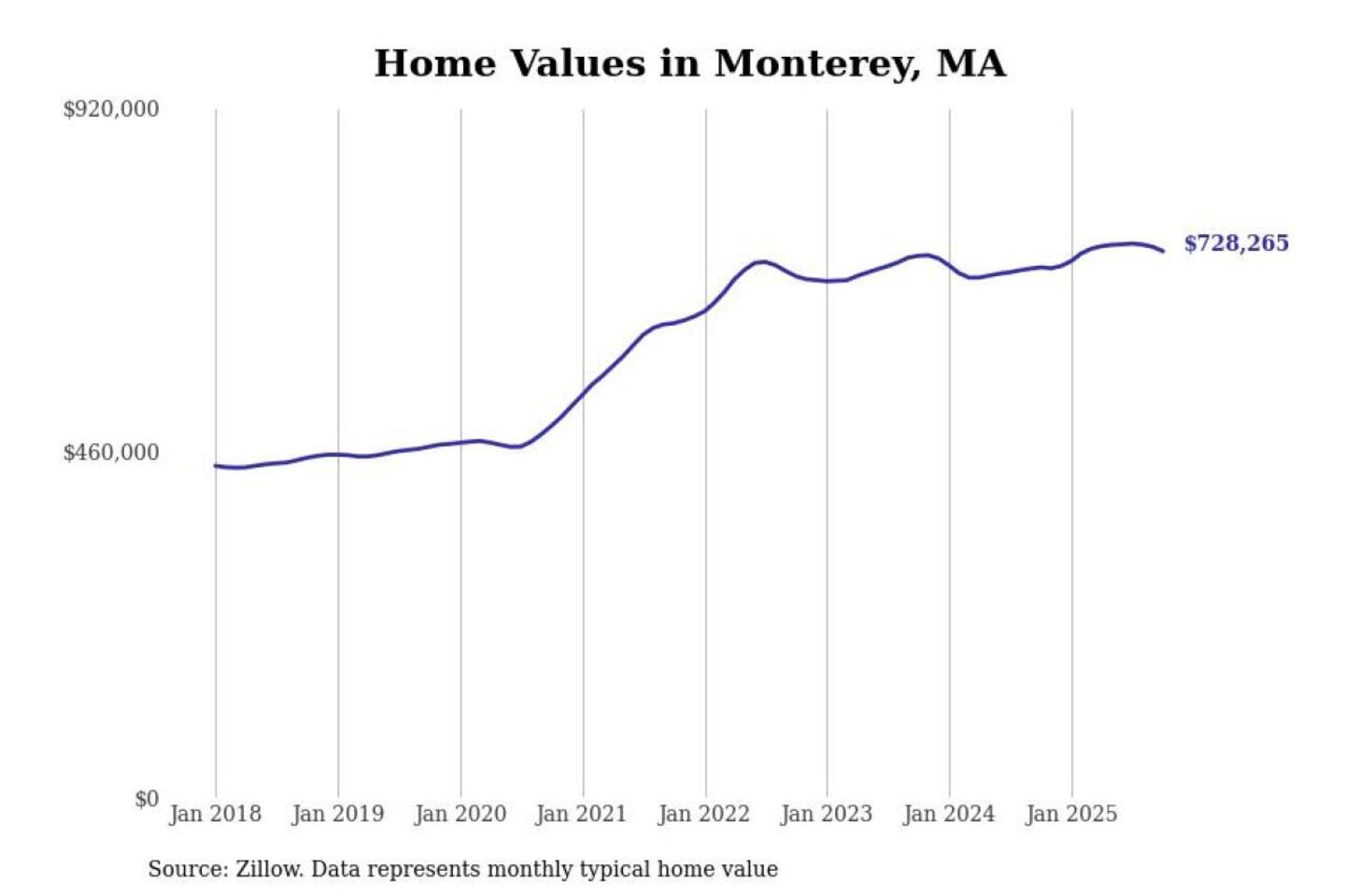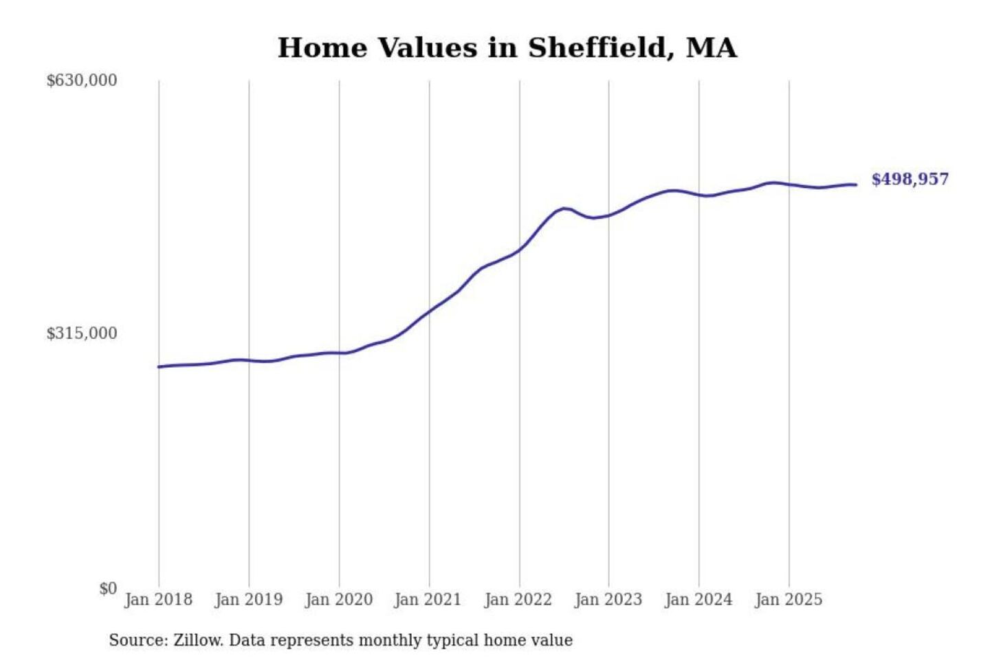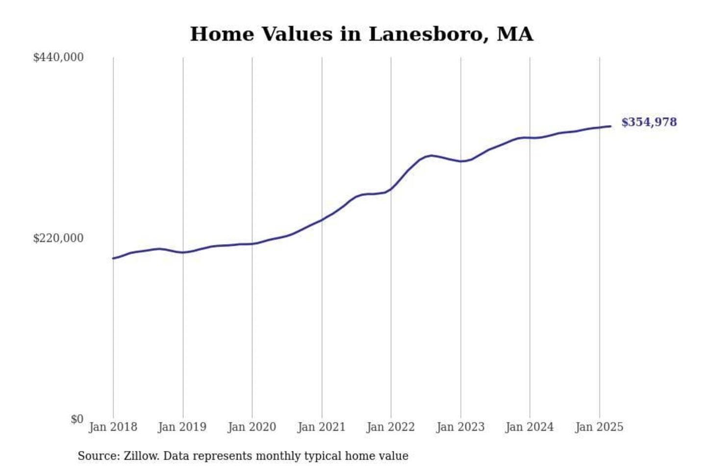 Stacker compiled a list of cities with the most expensive homes in the Pittsfield metro area using data from Zillow. Charts show the monthly typical home value since January 2018. All 29 cities and towns with data available were included in the list.