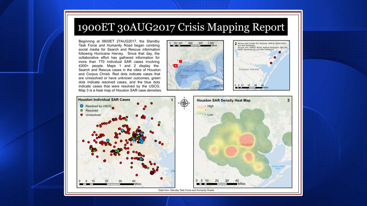 NEW LONDON, Conn. — U.S. Coast Guard Academy cadets are creating maps showing the locations of people in Texas who posted on social media that they needed help during Hurricane Harvey.