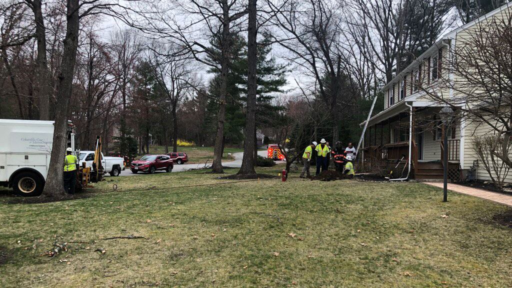 "Officials believe that the source of the leak is a valve or coupling located under the front yard of the residence. Columbia Gas is in the process of digging up the lawn to locate and stop the leak."