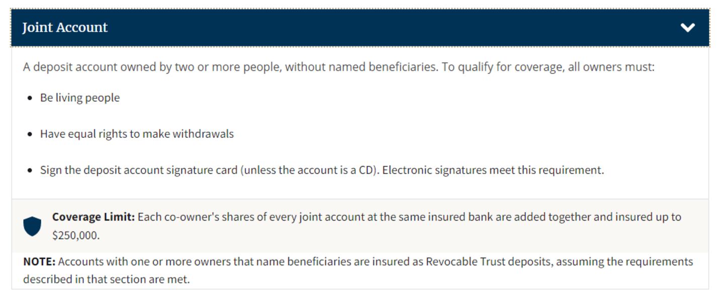 For example, here’s a screenshot of the FDIC rules about insurance on joint bank accounts.