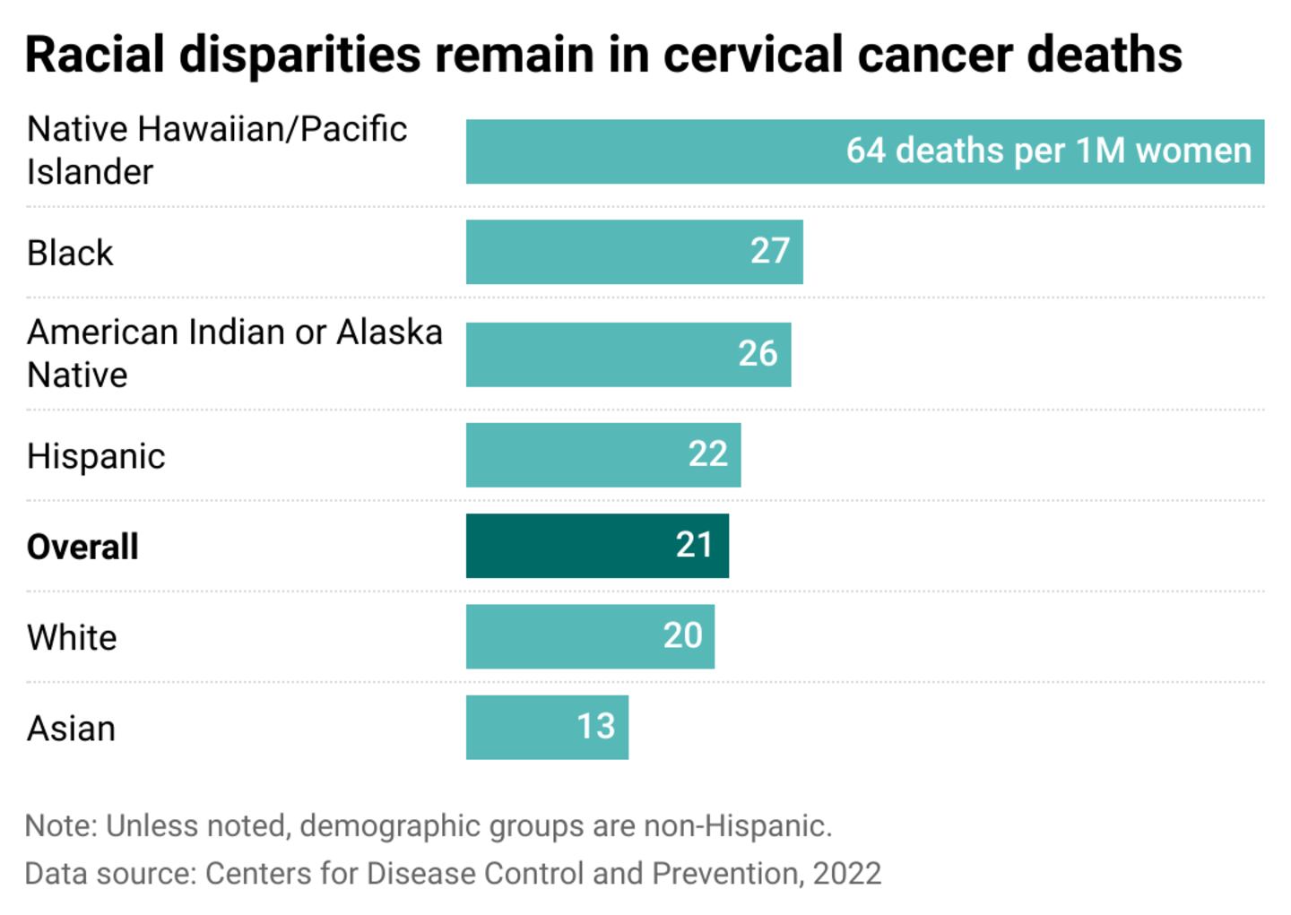 In 2022, there were about 21 cervical cancer deaths for every million women living in the United States, according to the CDC. Broken down by race, Native Hawaiians and Pacific Islanders have the highest rates of cervical cancer deaths in the U.S.