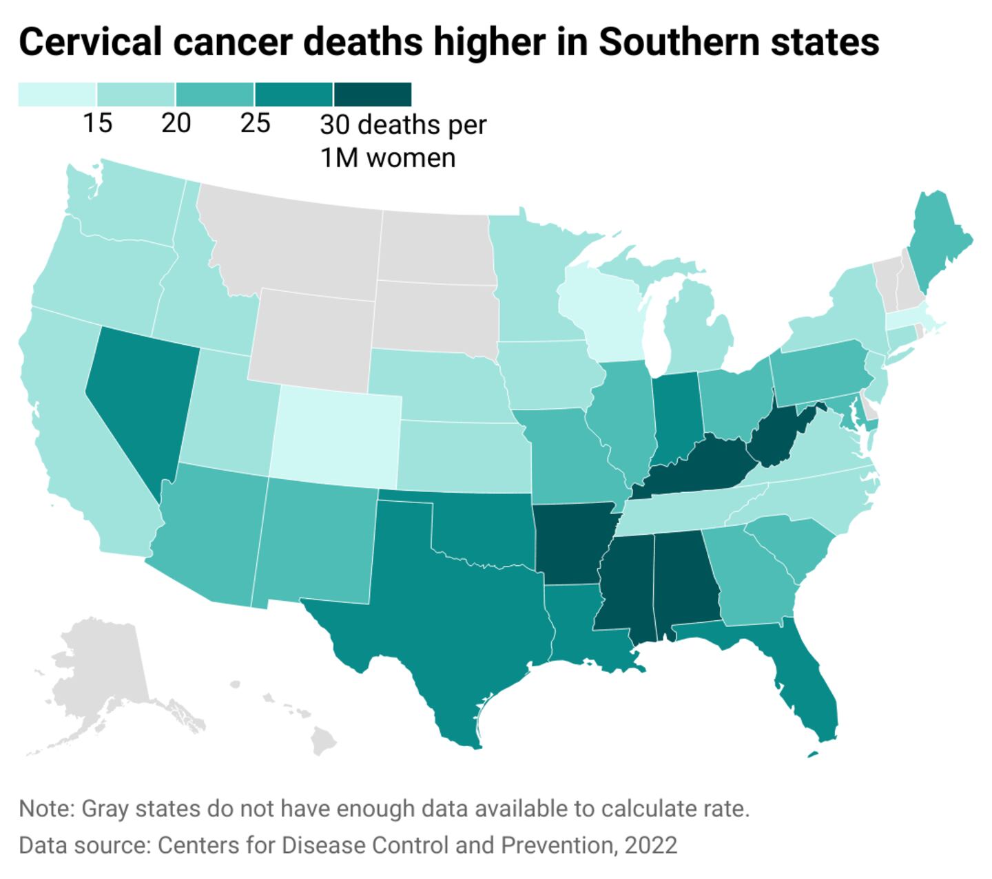 In the Lower 48, cervical cancer deaths are higher in states with large uninsured populations and a high percentage of Black residents.