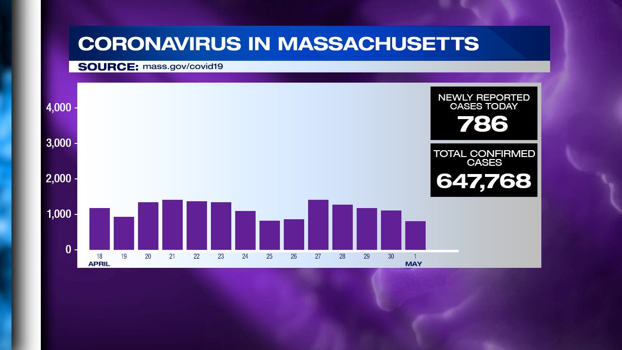 New coronavirus data released by the state’s Department of Public Health reported Sunday looked promising, with 786 new cases reported---the first time new cases have fallen back under 1,000 since April 27. Since the pandemic began in March 2020, the commonwealth has seen 647,768 total confirmed cases of the coronavirus, including an estimated 24,104 active cases.