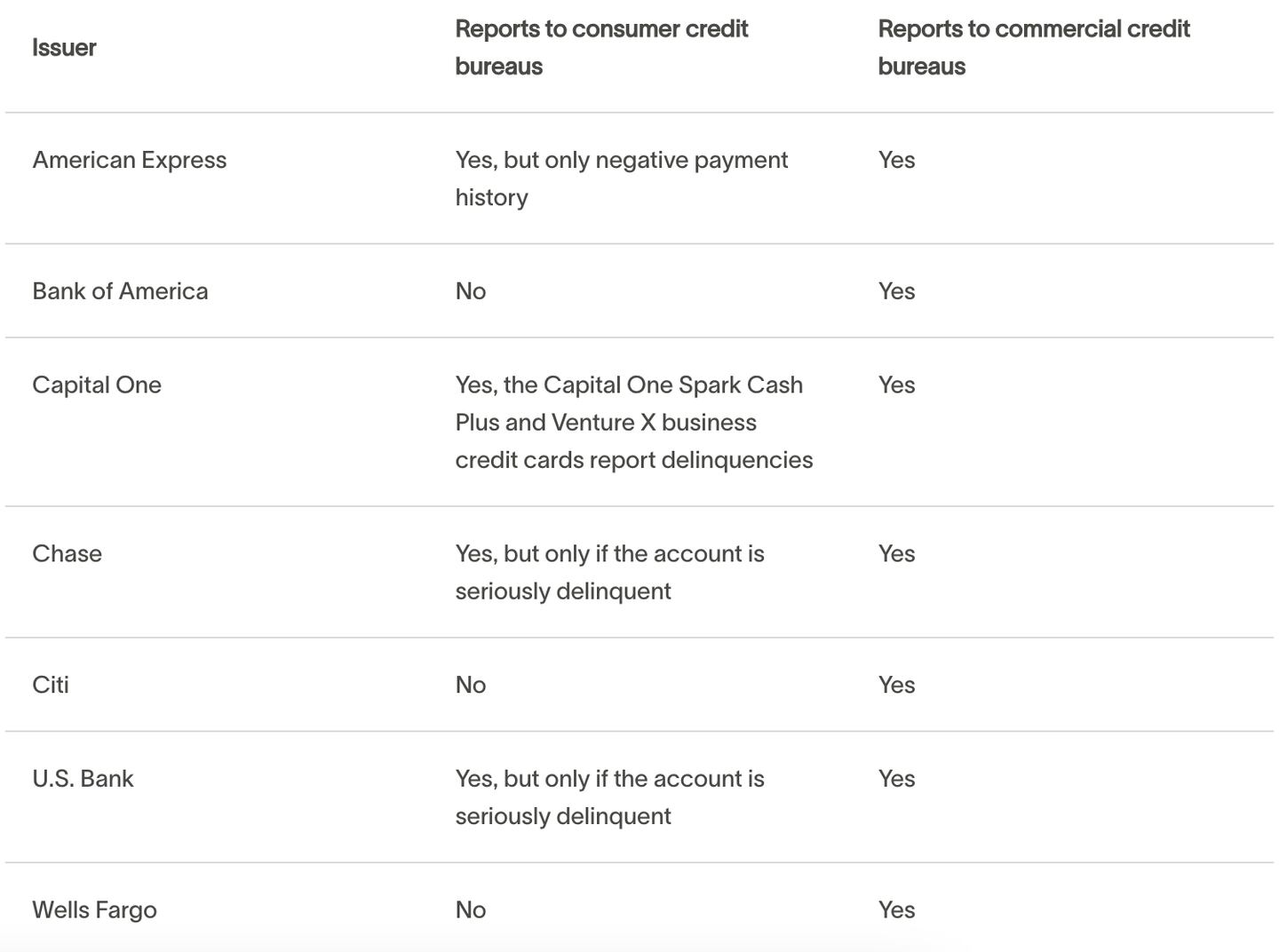 Certain business credit cards, like the Capital One Venture X Business and Capital One Spark Cash Plus, will report late payments and serious delinquencies to the consumer credit bureaus, negatively impacting your personal credit score.