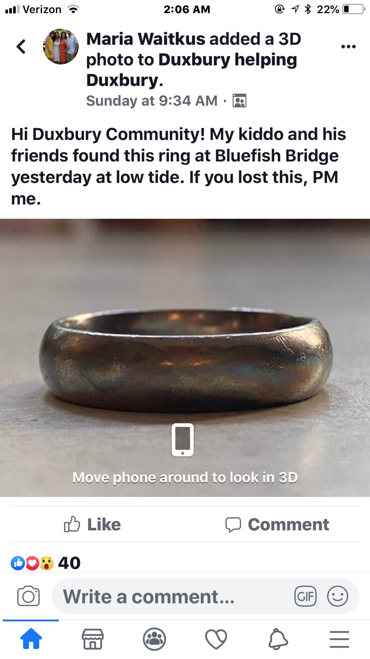 The Duxbury father of two lost his wedding ring while jumping off the Blue Fish Bridge in Duxbury last summer. He thought he’d never see it again. But a few days ago, a group of 12-year-old boys spotted the ring by the bridge at low tide.