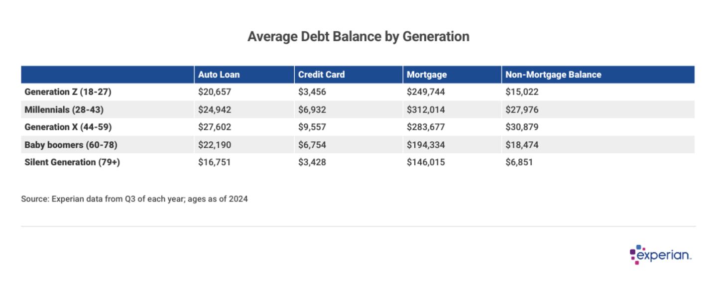 Generation X led all other generations in having the highest average auto loan, credit card and total non-mortgage balances. Each average balance eclipsed both older baby boomers and younger millennials by significant margins.