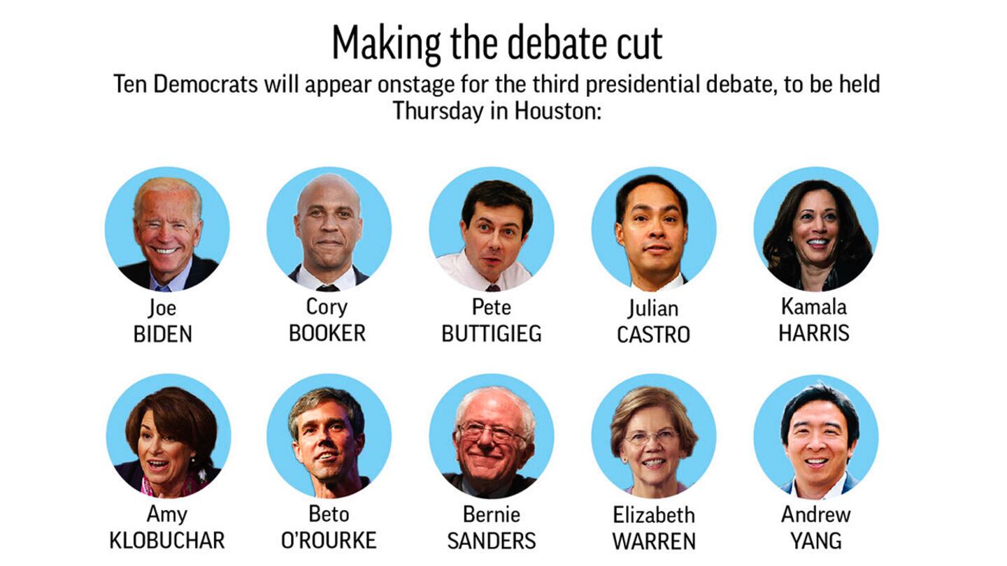 6:30 p.m. Sept. 12, 2019: ABC, the network hosting the debate, has announced tonight's debate rules. The candidates will have one minute and 15 seconds for direct responses to questions asked by the moderators. They will get 45 seconds for rebuttals.
