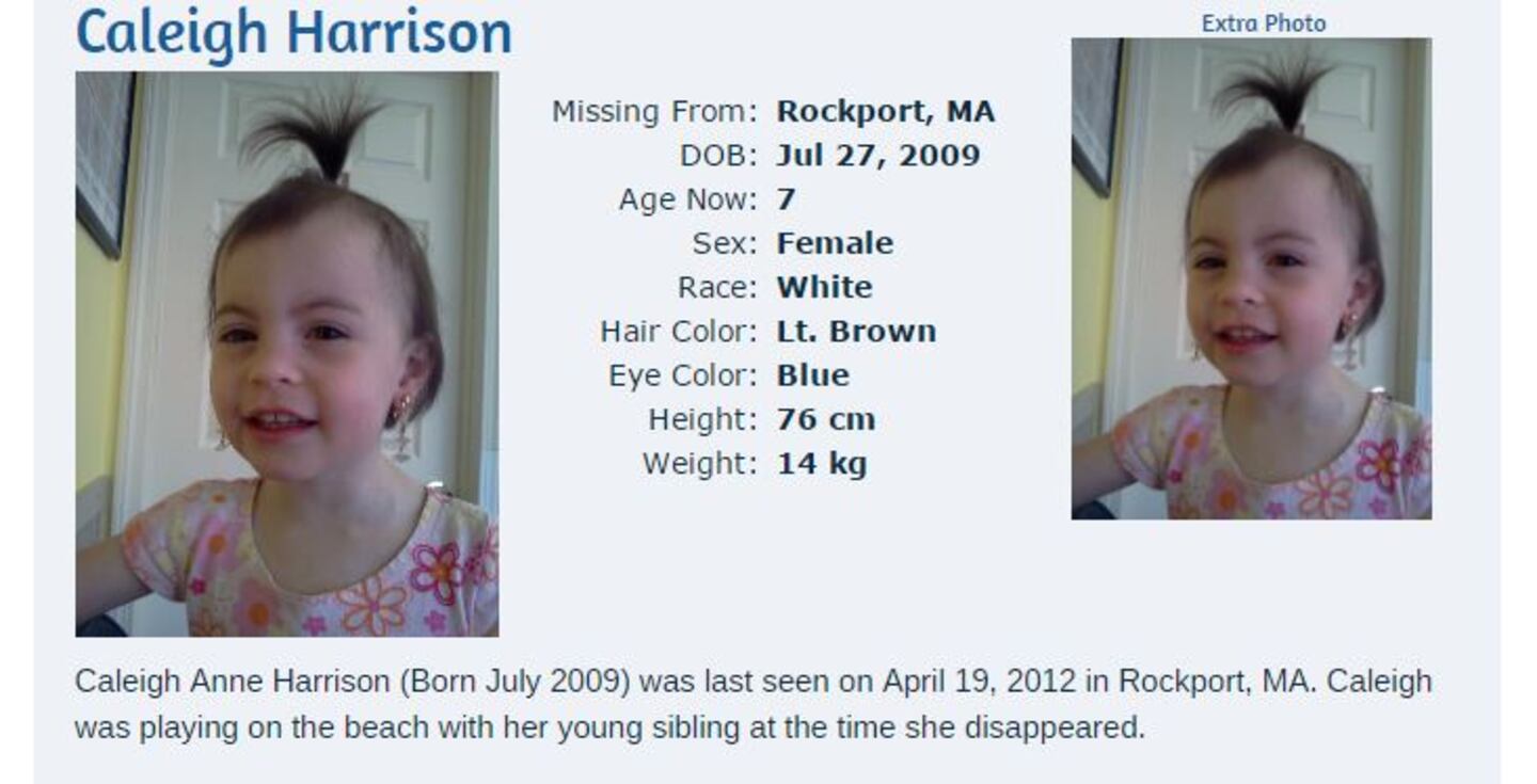 Caleigh Harrison was with her mother and her sister at the beach. Her mother told police she walked away to grab a ball they had been playing with; in that short time, Caleigh disappeared. It’s presumed she swept away by the sea.