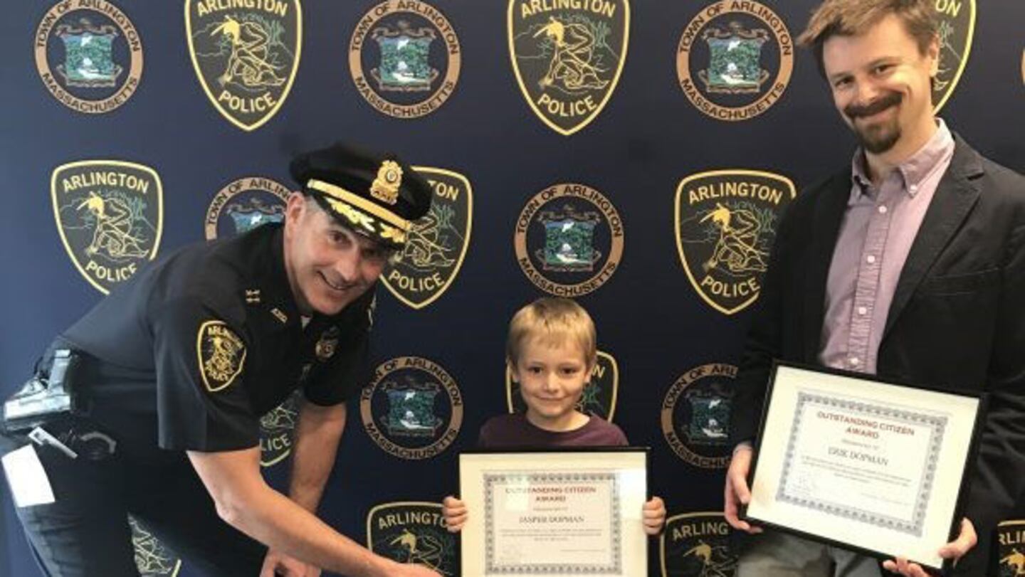 Police said Jasper Dopman was walking on Medford Street with his father, Erik, on Tuesday when he spotted a bag on the ground. Inside the bag was cash and deposit slips; Erik called police and turned the bag in.
