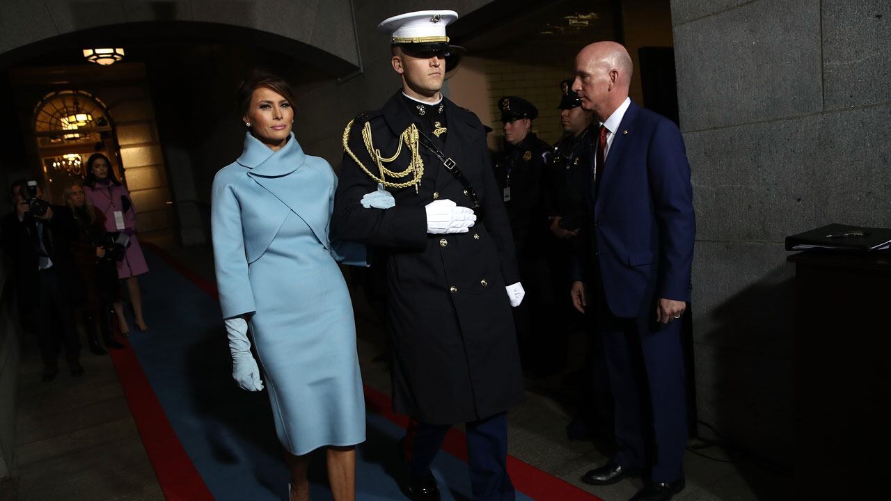 As is customary for many incoming first ladies, Trump wore clothes by an American designer. Harper's Bazaar reported that she donned a powder-blue dress with a cropped jacket by Ralph Lauren and pointed-toe pumps and elbow-length gloves to match.