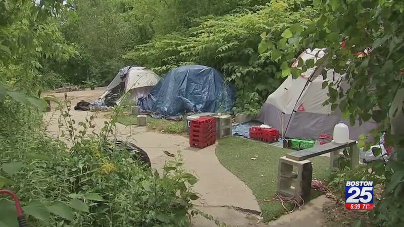 FITCHBURG, Mass. — One tent after another. Boston 25 News sent the drone up to capture a homeless camp in Fitchburg. It's right next to a river and there is not much else in the area, but the health department is ordering the group to get out.
