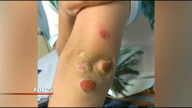 Brenda put Neosporin on the affected skin and did not think anything of it. The marks did not get better. They were growing and spreading. The ones on his arm grew tremendously bigger and became open sore wounds. Brenda said the wounds were spreading and painful. "It was oozing and when it was oozing it spreads... he said they were hurt to touch."