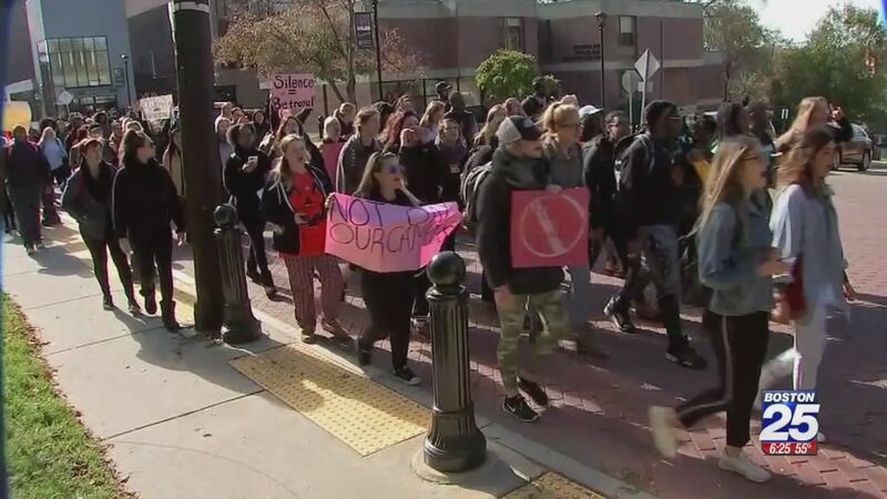 FRAMINGHAM, Mass. — A crowd of students walked out of classes and marched around the Framingham State University campus Tuesday in response to an ongoing issue with racist incidents on the campus.