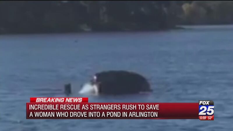 ARLINGTON, Mass. — Good Samaritans dove into a pond to rescue a woman who had accidentally driven in.