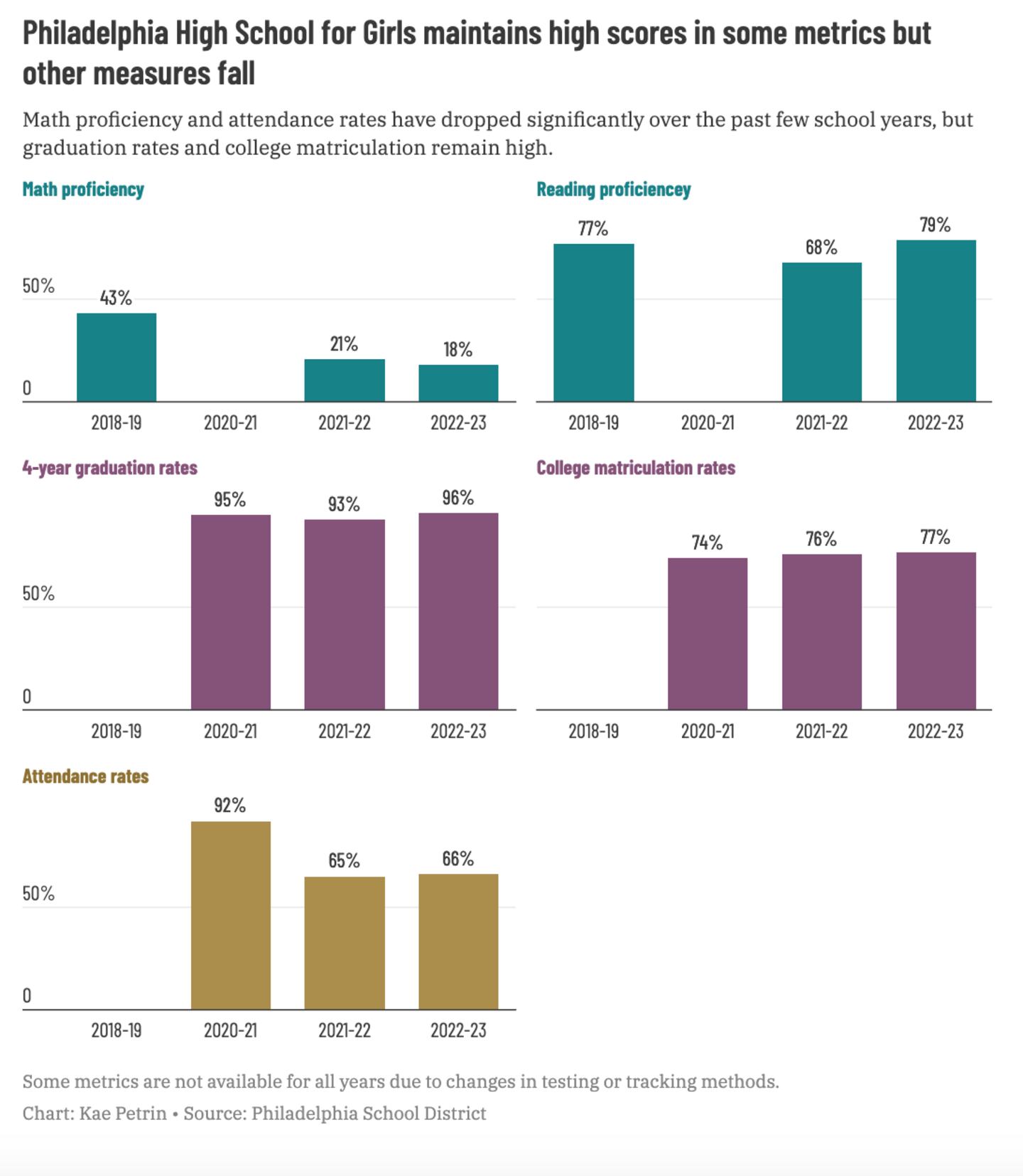 But just like the number of Girls High students, district enrollment has fallen in recent years. The year after Argro graduated high school, district-run schools enrolled 205,000 students; that figure has now fallen to around 120,000, due to both charter proliferation and a city population dip.