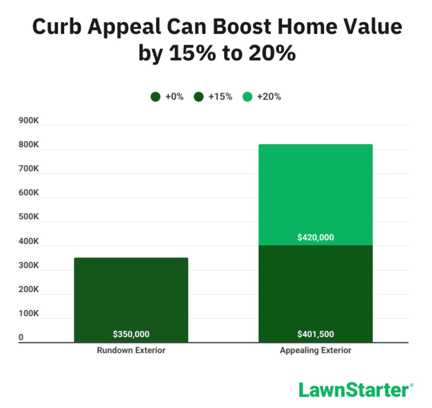 Savvy buyers notice your lawn first, and it's worth around 5% of your total landscaping ROI. Depending on your home's price, your lawn could add an extra $25,000, turning your green lawn into gold.