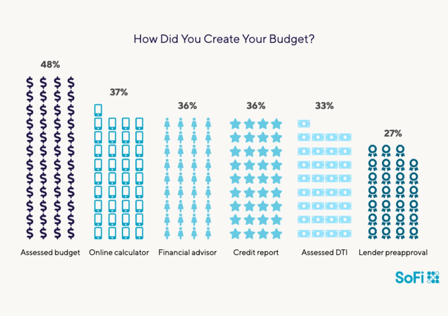 Would-be homeowners were using several methods to establish their budget. Forty-eight percent were assessing their current budget, while 37% used an online home affordability calculator. Consulting a financial advisor was also popular: 36% of people used this method. Reviewing credit scores and reports was a popular step for 36% as well. A third of shoppers (33%) assessed their debt-to-income (DTI) ratio. Twenty-seven percent got preapproved by a lender as a way of determining their budget.