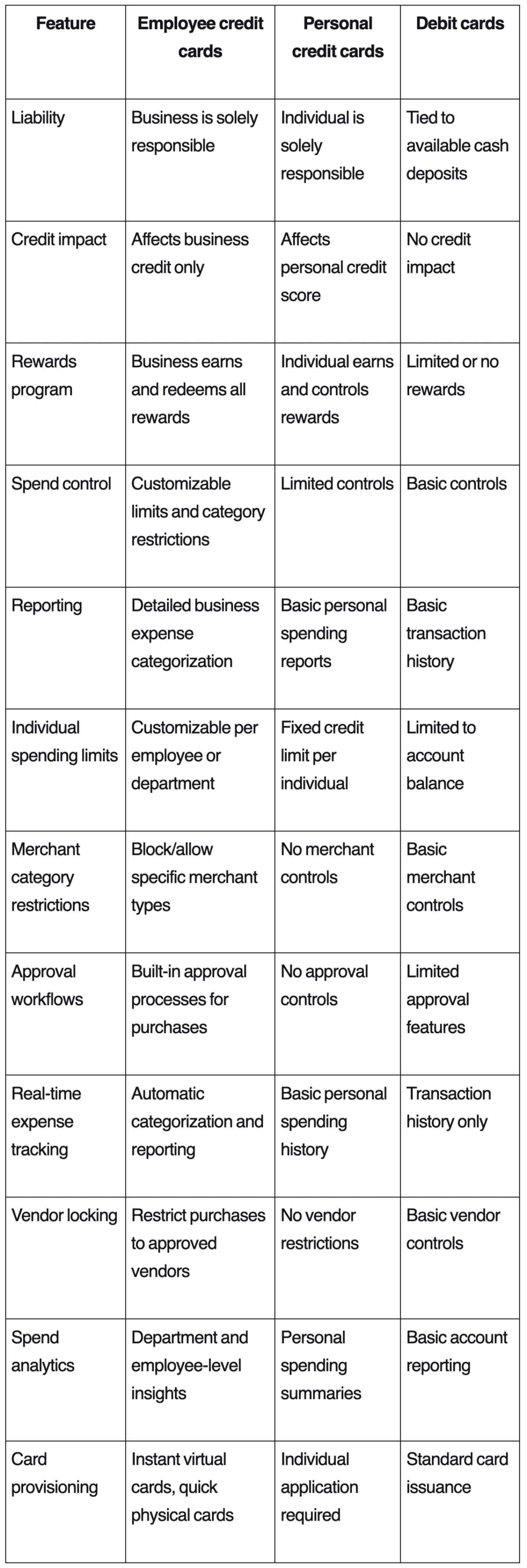 Employee credit cards differ from personal credit cards and other business payment methods in several important ways. They give your employees purchasing freedom while maintaining full control and visibility. This balance lets your team make necessary purchases while giving you the oversight to manage business spending effectively.