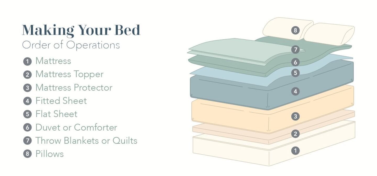 There’s more to a well-made bed than just tossing on a comforter and calling it a day. Here’s a simple order of operations to guide you — complete with a visual breakdown to see exactly how each layer stacks up.