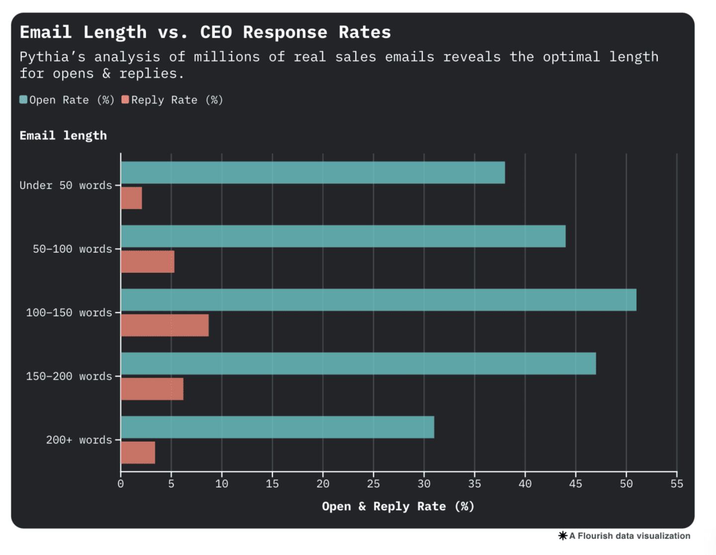 This data reveals the exact email length that maximizes both opens and replies for CEOs — too short and you're vague, too long and you're deleted. The peak? 100-150 words get 52% open rates and 9.1% replies, crushing every other length.