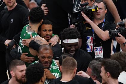 Celtics Pacers Basketball Boston Celtics head coach Joe Mazzulla celebrates with forward Jayson Tatum, left, after Game 4 of the NBA Eastern Conference basketball finals against the Indiana Pacers, Monday, May 27, 2024, in Indianapolis. The Celtics won 105-102.(AP Photo/Michael Conroy) (Michael Conroy/AP)