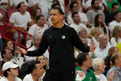 Boston Celtics head coach Joe Mazzulla during Game 2 of the NBA basketball Eastern Conference Finals series, Friday, May 19, 2023, in Boston. (AP Photo/Charles Krupa)