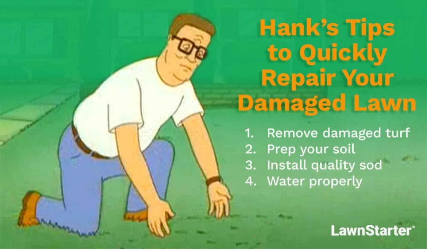 When Hank’s cousin, Dusty Hill, digs up his lawn as a prank for a reality show, viewers don’t actually see Hank repair the lawn, but it’s back to pristine condition quickly. If your lawn comes under attack from a Dusty or some other unscrupulous vermin, channel your inner Hank Hill and focus on getting your grass back to its epic standard.